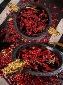 1.火鍋紅油(老油)的制作 取牛油(清油)或兩種的混合油100公斤,放入鍋中燒至170度,去除生油味,待溫度降至160度時(shí),加入生姜片、大蒜各2-5公斤,用微火煎干去渣,再加入各3 -